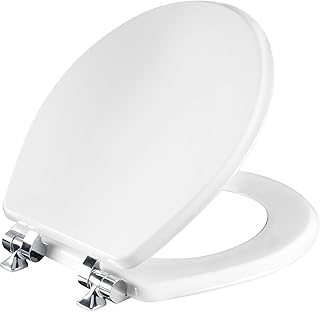 Bennett Toilet Seat with Chrome Hinges, Slow Close Wood Seat, Secure Metal Hinges, Easy Install, Made in USA, Round, White